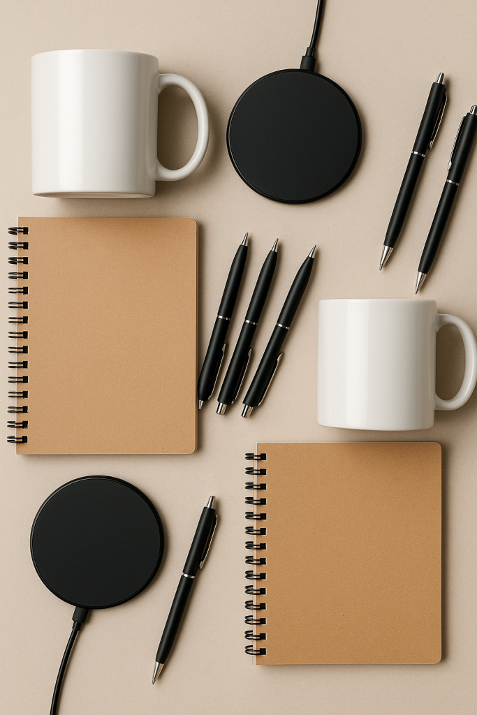 - Promotional items (pens, mugs, USBs, bags)