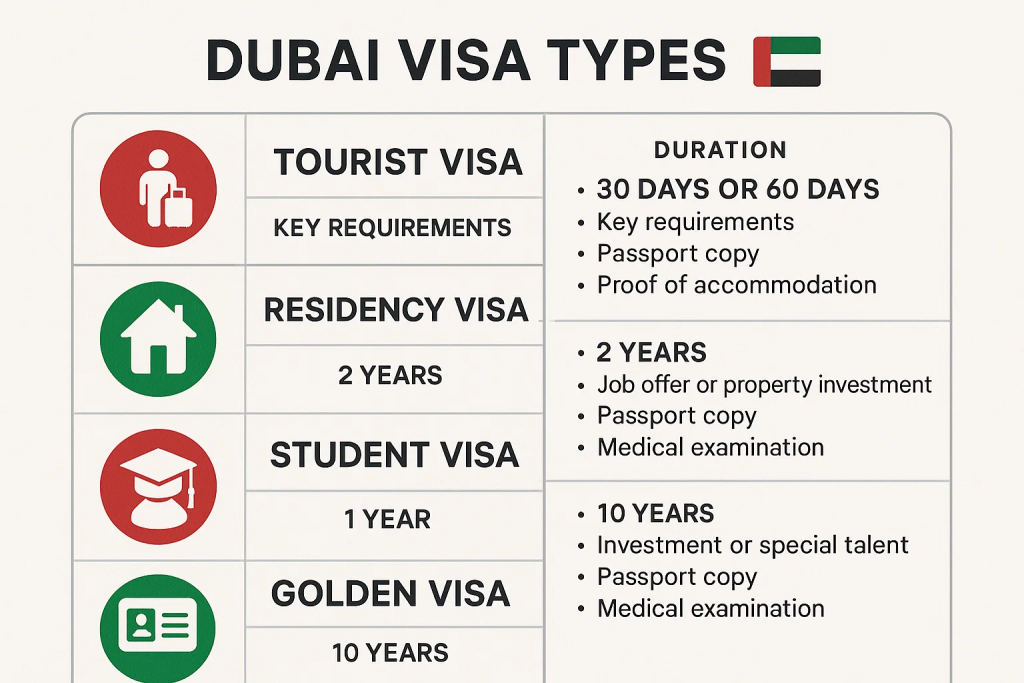 - GDRFA (General Directorate of Residency and Foreigners Affairs) for Dubai-specific visas.