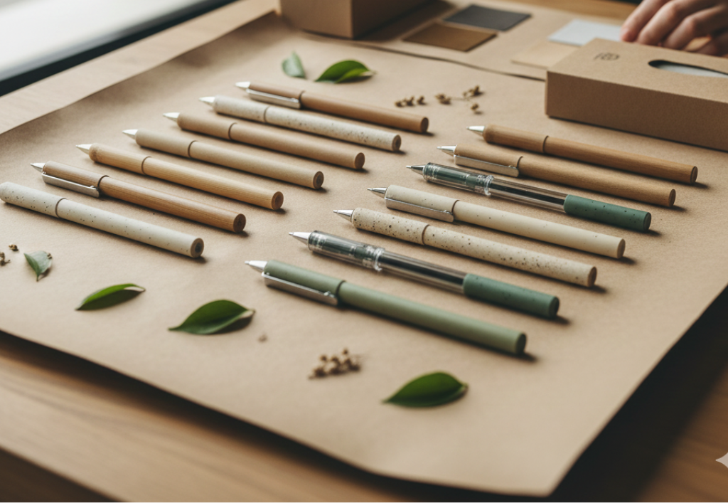 - Eco-friendly pen options (bamboo, wheat straw, recycled materials)